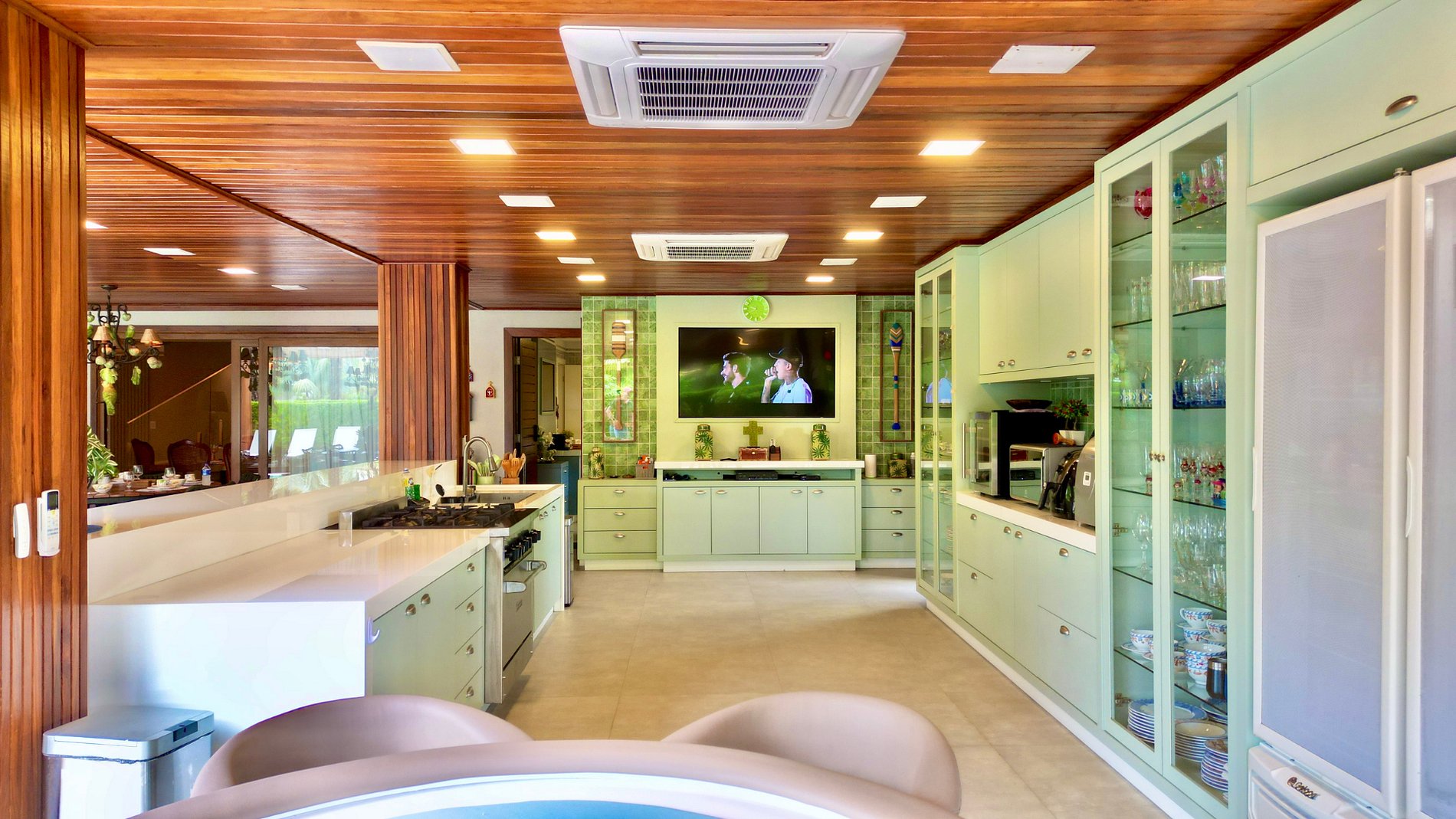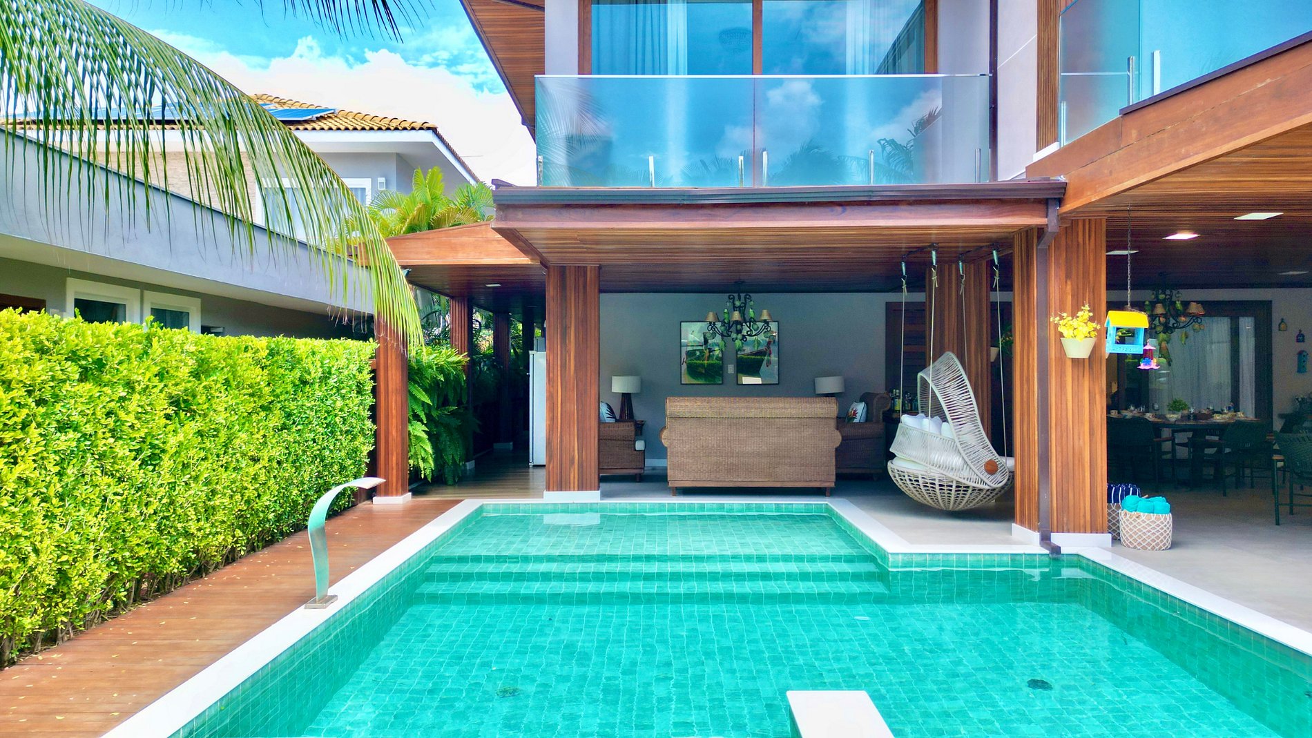 Os hóspedes terão acesso a todas as áreas comuns da casa, incluindo salas, cozinha, espaço gourmet, suítes do primeiro andar e áreas de lazer externas.