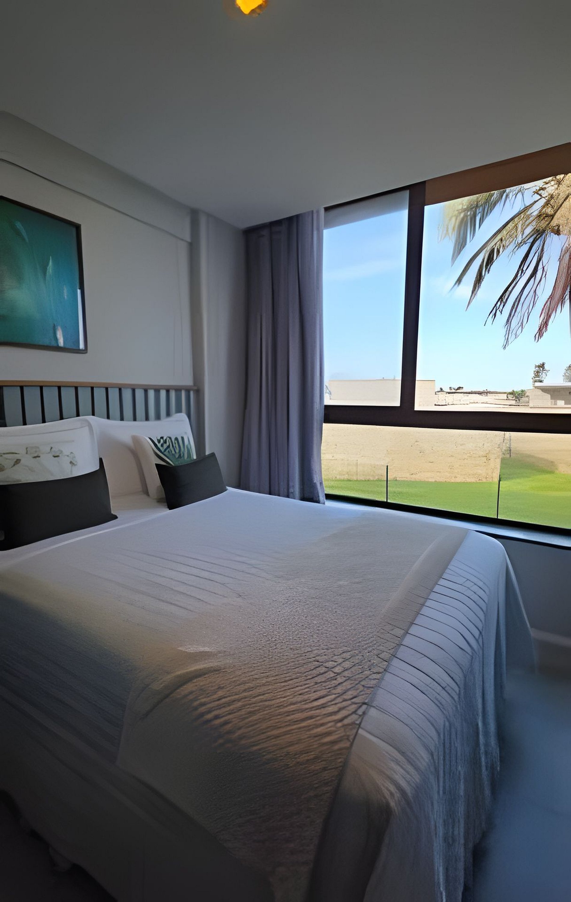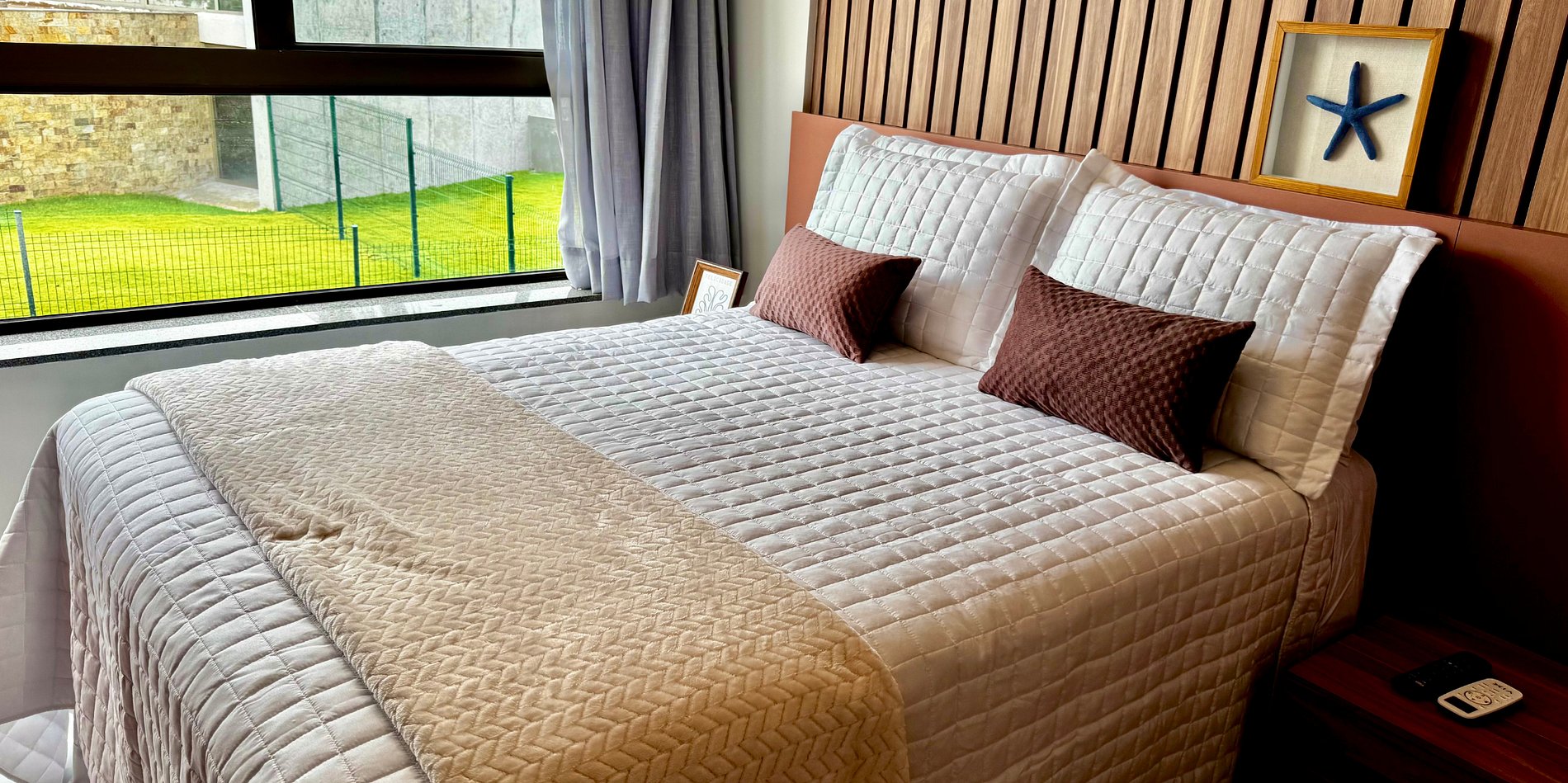 2. Conforto e Vista Mar em Todos os Quartos: Garantimos o máximo de conforto com três quartos climatizados (3 camas de casal), sendo duas suítes no piso superior, todos equipados com Smart TV e vista lateral do mar. O apartamento é térreo e oferece um aconchegante garden privativo.