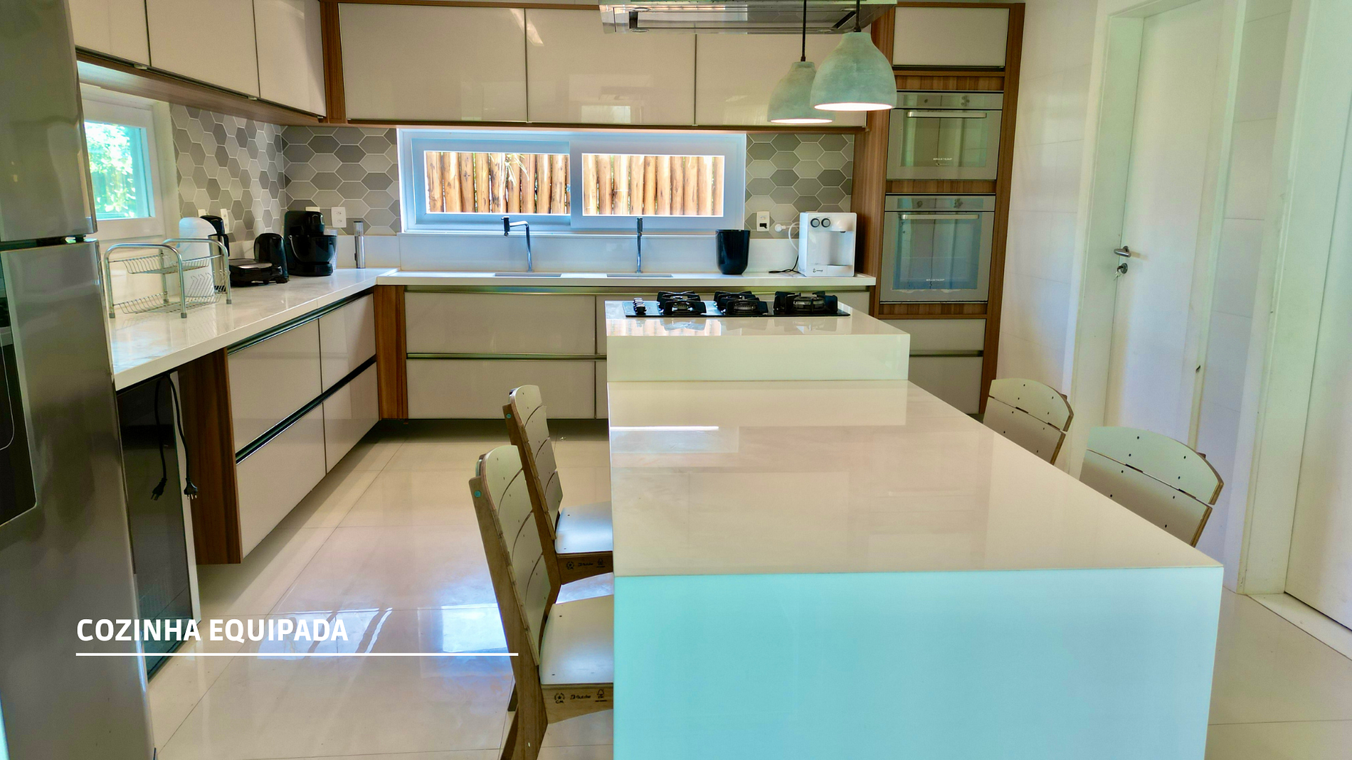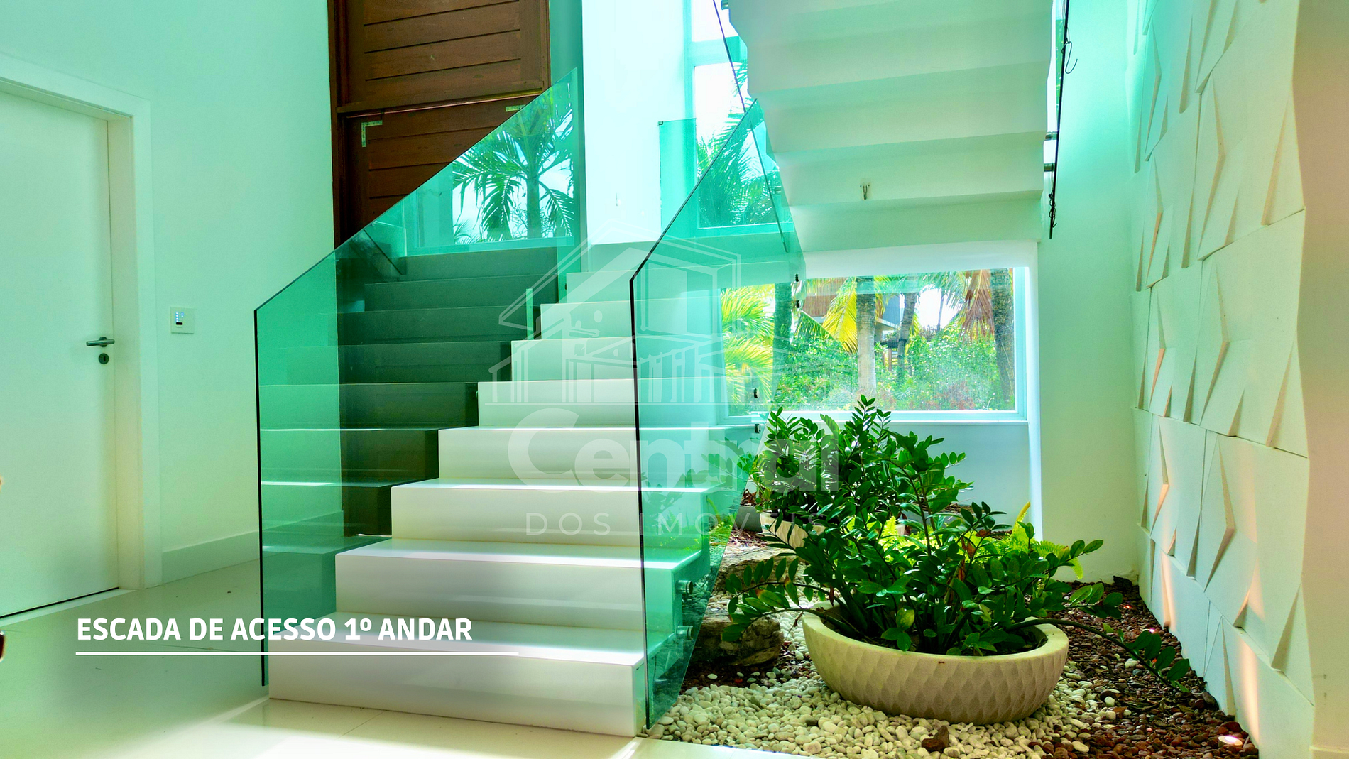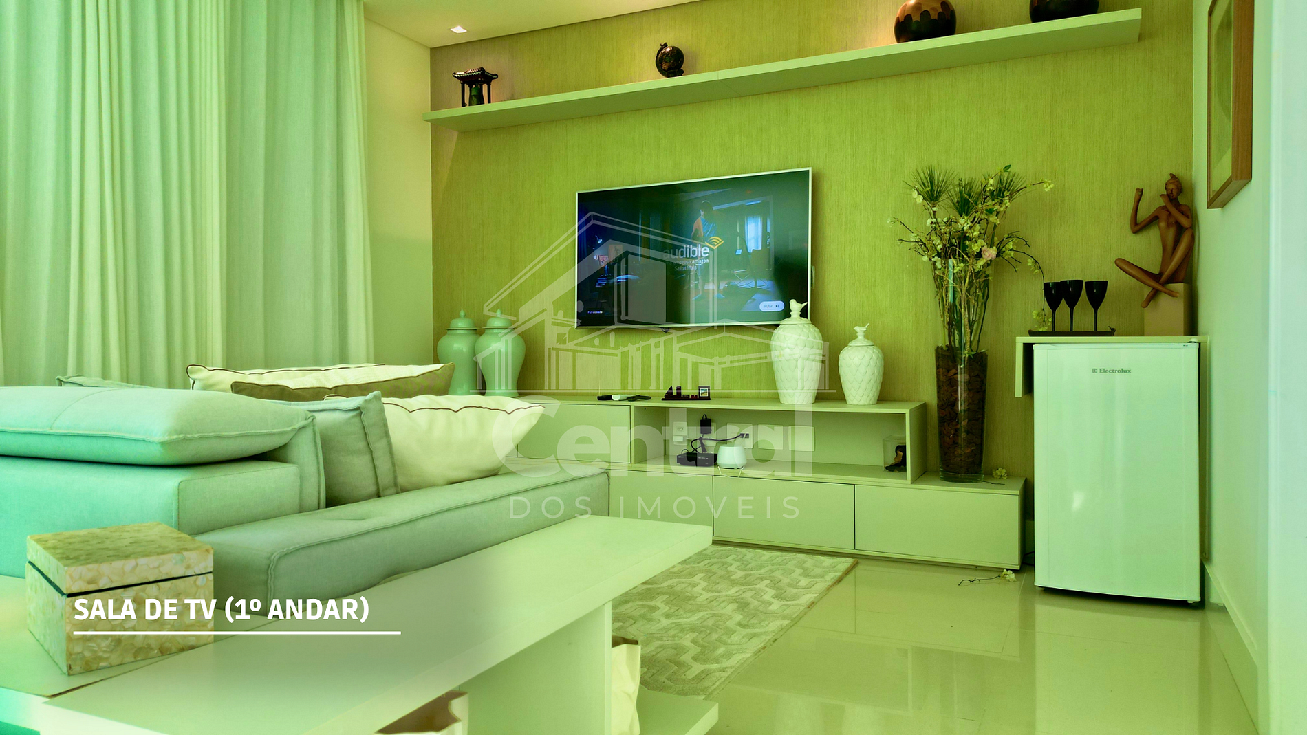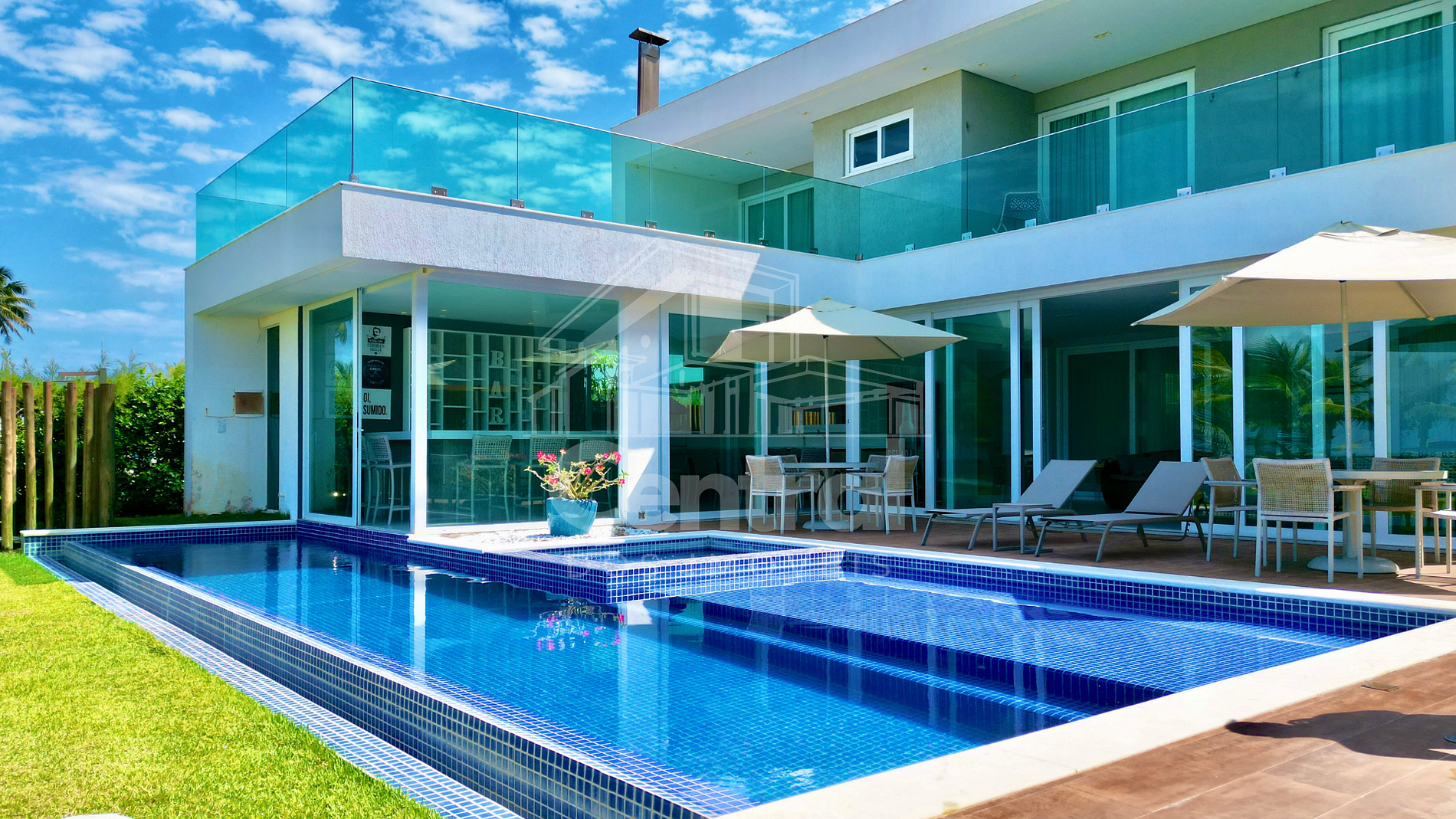 Térreo Uma suíte, sala com dois ambientes, sala de cinema climatizada com sofazao para cinco lugares, lavabo da sala, cozinha completa totalmente equipada, varandão frente mar com área de TV, lavabo da área gourmet, área gourmet com churrasqueira, cervejeira, bar, piscina com dois níveis de profundidade totalmente iluminada com hidromassagem, ampla área verde com quadra para FUT vôlei e Beach tênis, palco para shows, jacuzzi, sala de troféus, salão de jogos e muito mais