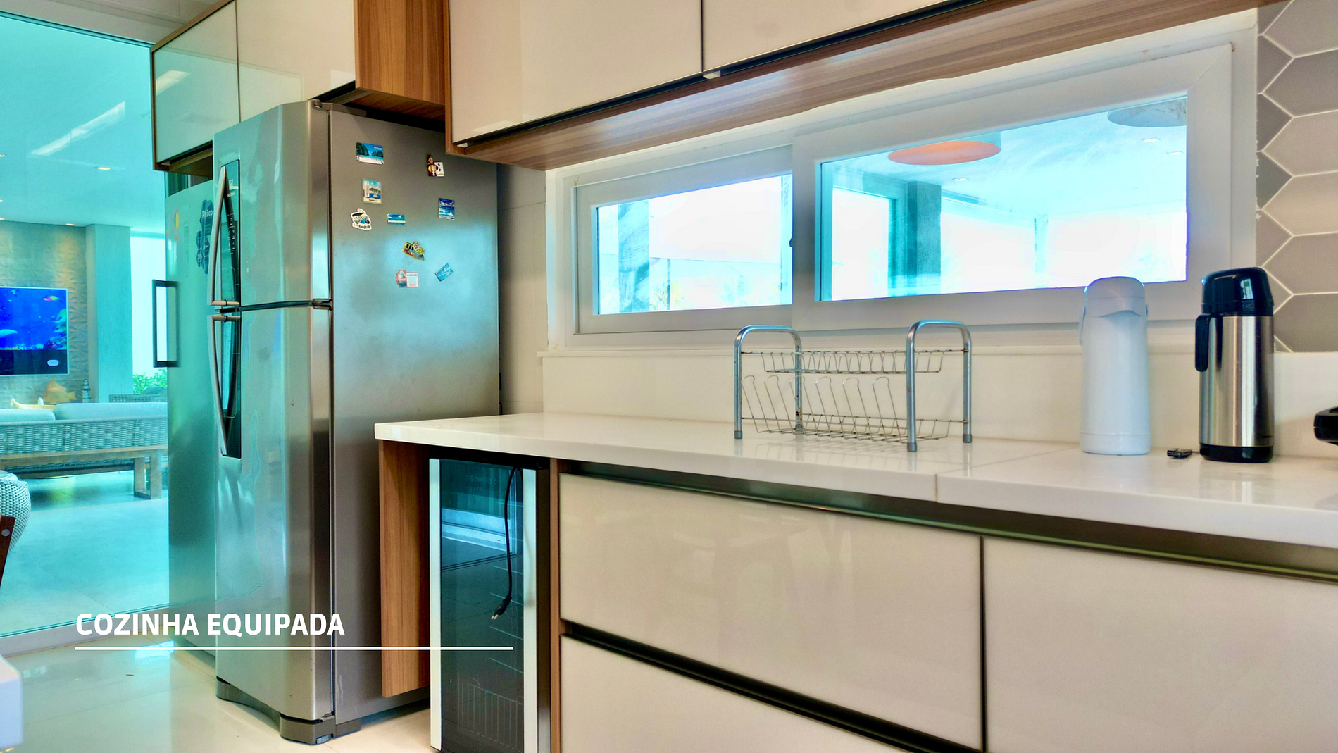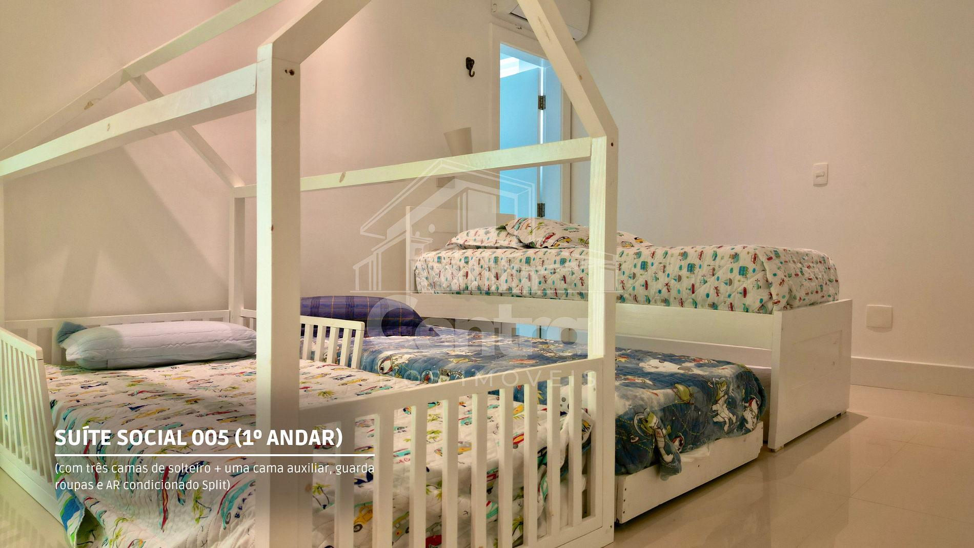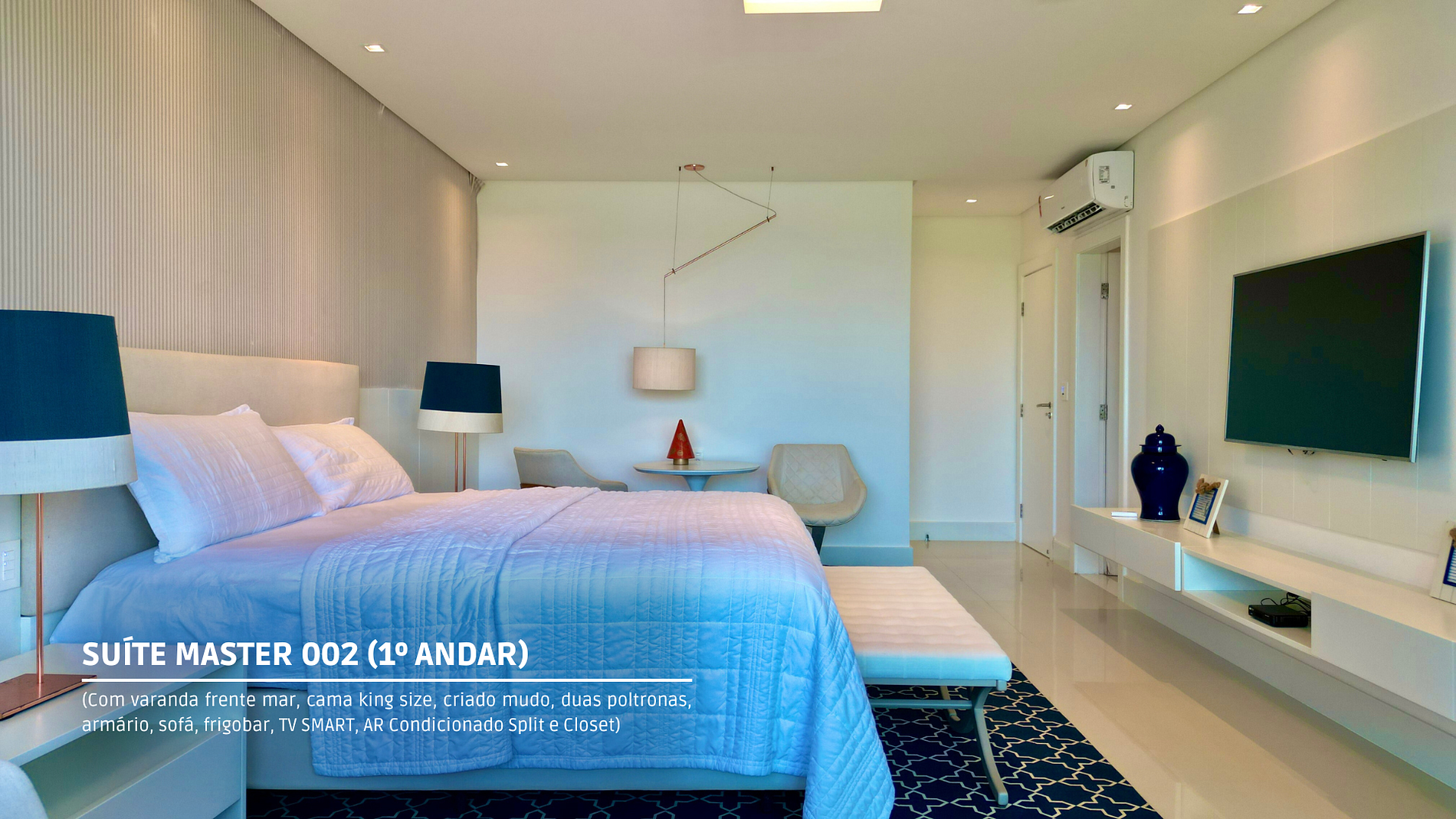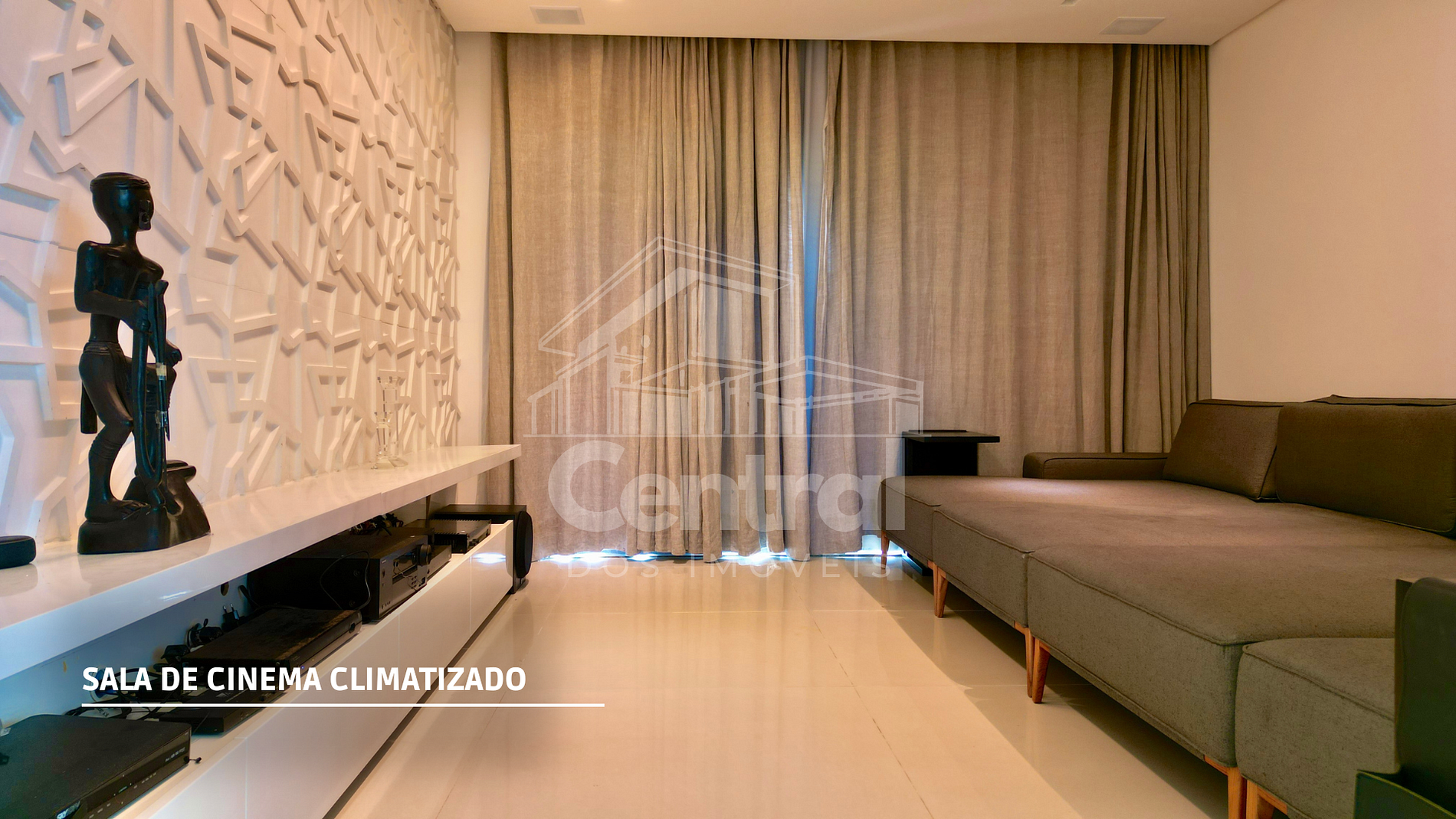 Térreo Uma suíte, sala com dois ambientes, sala de cinema climatizada com sofazao para cinco lugares, lavabo da sala, cozinha completa totalmente equipada, varandão frente mar com área de TV, lavabo da área gourmet, área gourmet com churrasqueira, cervejeira, bar, piscina com dois níveis de profundidade totalmente iluminada com hidromassagem, ampla área verde com quadra para FUT vôlei e Beach tênis, palco para shows, jacuzzi, sala de troféus, salão de jogos e muito mais