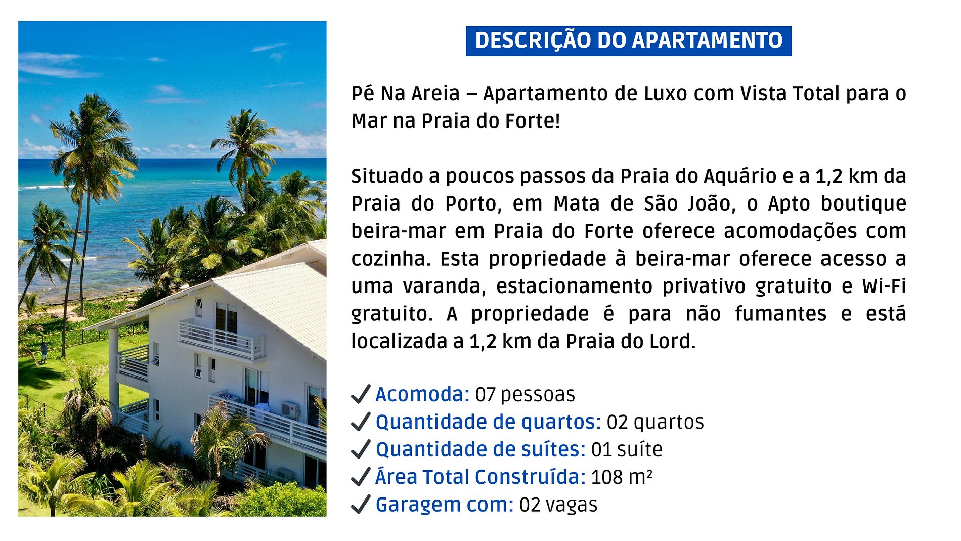 The beachfront apartment in Praia do Forte, near Aquário Beach and 1.2 km from Porto Beach, offers accommodations with kitchen, balcony, free parking, and Wi-Fi. Non-smoking property, 1.2 km from Lord Beach.