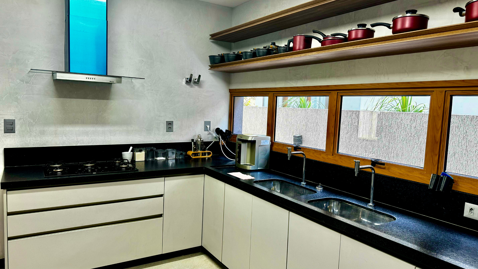 Cozinha totalmente equipada com todos os utensílios básicos para sua comodidade, incluindo Air Fryer, cafeteira, sanduicheira, batedeira e liquidificador. Conta ainda com uma moderna geladeira Brastemp Xpert Inverter de três portas, torre quente com micro-ondas Brastemp e forno Electrolux, além de um purificador de água gelada IBBL. Para garantir um ambiente sempre agradável, dispõe de um depurador de ar Philco Coifa 90 Flat, unindo praticidade, eficiência e sofisticação.