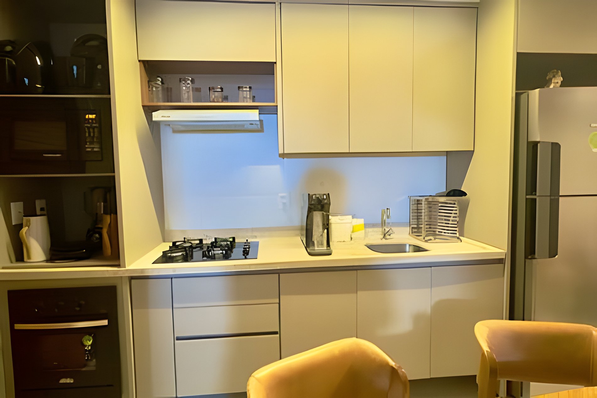 A cozinha é completa, com geladeira, cooktop, micro-ondas, utensílios e cafeteira.