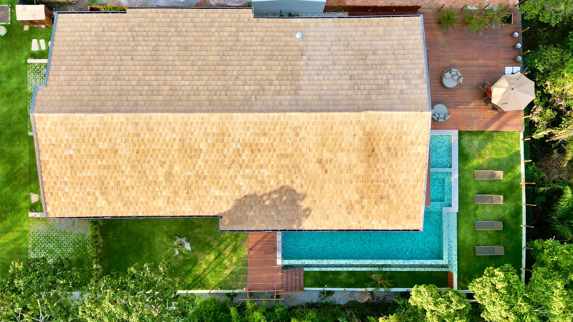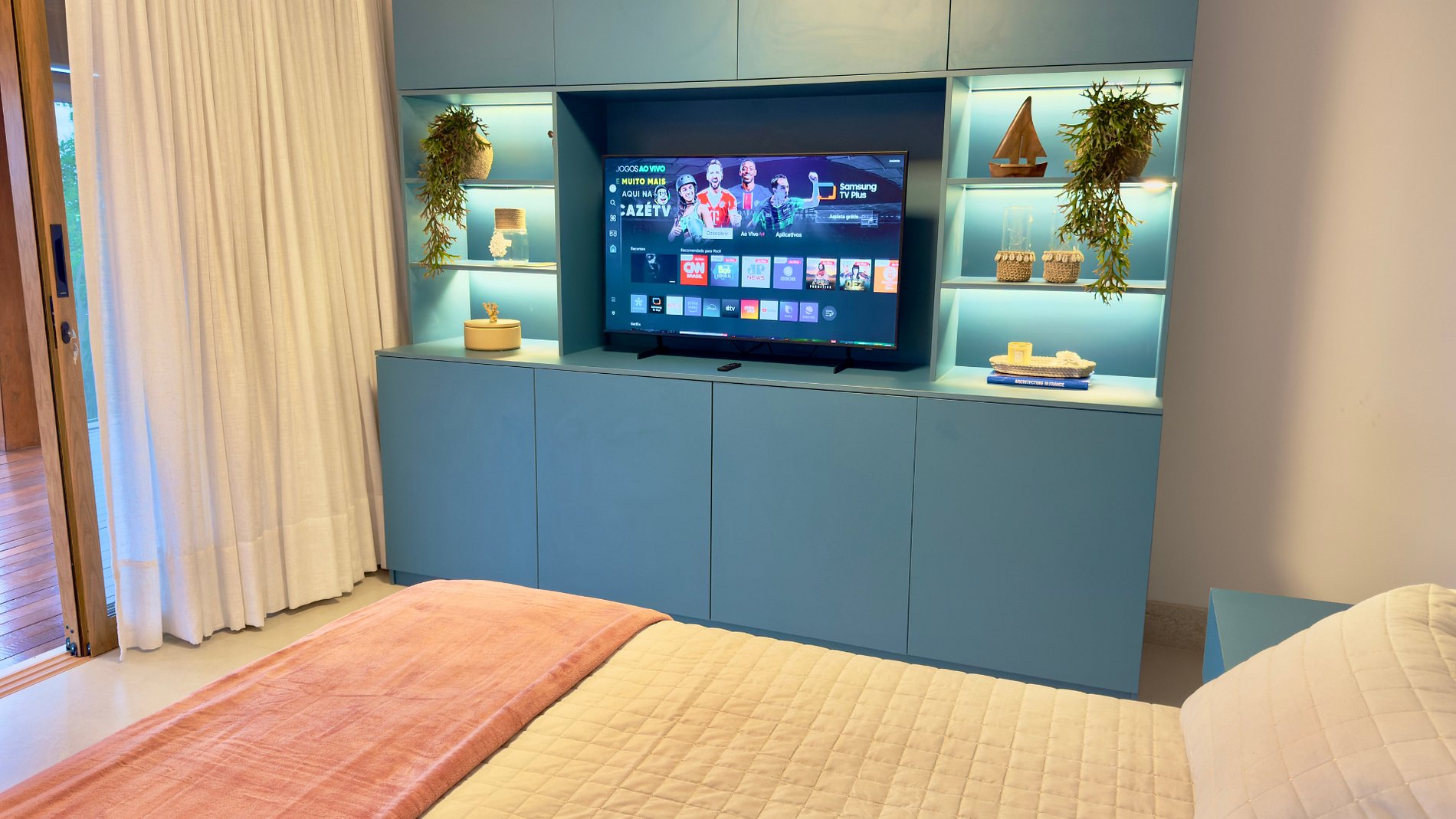 A Casa Assunção foi desenhada para privacidade e convivência. Lote de esquina, sem vizinhos colados: você curte o varandão com deck, som integrado e um espaço gourmet completo enquanto a turma vive a piscina com borda infinita e hidromassagem. A sala tem pé-direito duplo e é 100% climatizada, integrada à cozinha equipada — tudo flui. As 5 suítes (duas masters com varanda e vista mar) garantem conforto real; há ainda dependência. Perto da praia e da vila. Conclusão: sossego quando quiser, movimento quando der vontade.