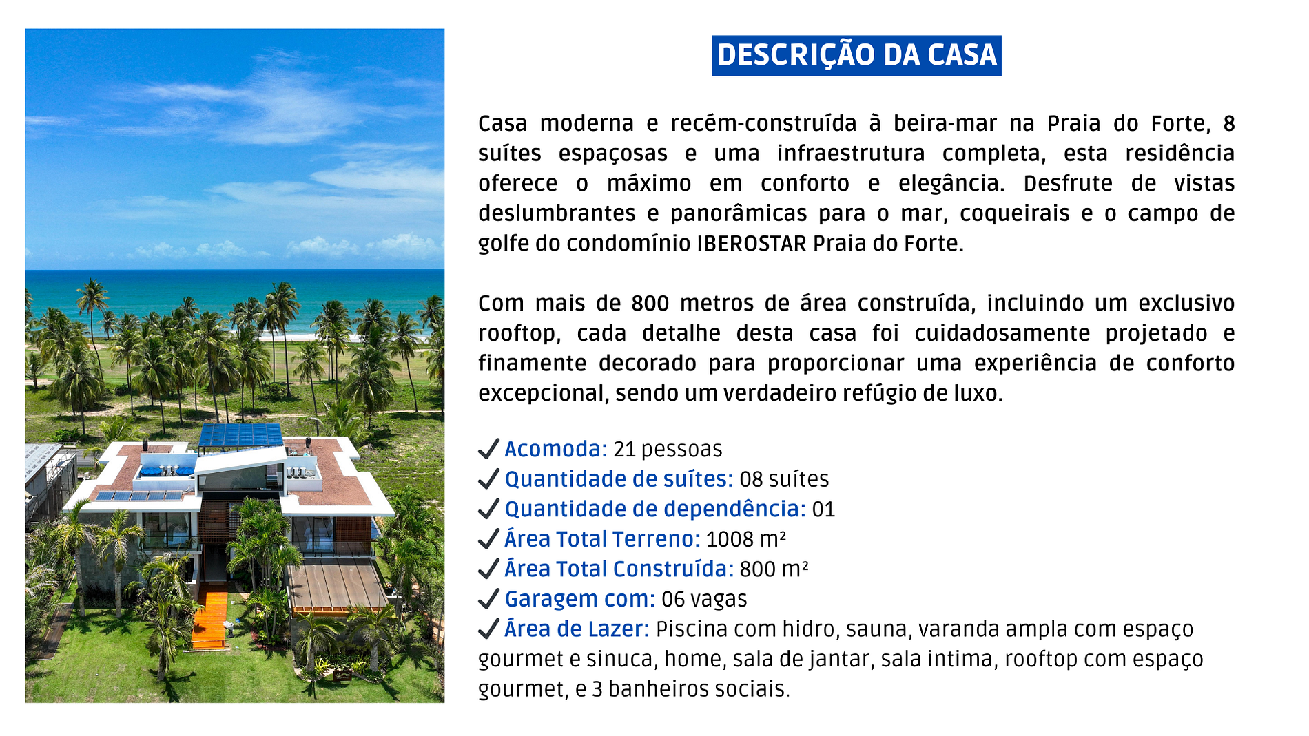 Casa moderna e recém-construída à beira-mar na Praia do Forte. Oito suítes espaçosas e uma infraestrutura completa, esta residência oferece o máximo em conforto e elegância. Desfrute de vistas deslumbrantes e panorâmicas para o mar, coqueirais e o campo de golfe do condomínio IBEROSTAR Praia do Forte. Com mais de 800 m² de área construída, incluindo um exclusivo rooftop, cada detalhe desta casa foi cuidadosamente projetado e finamente decorado para proporcionar uma experiência de conforto excepcional, sendo um verdadeiro refúgio de luxo.