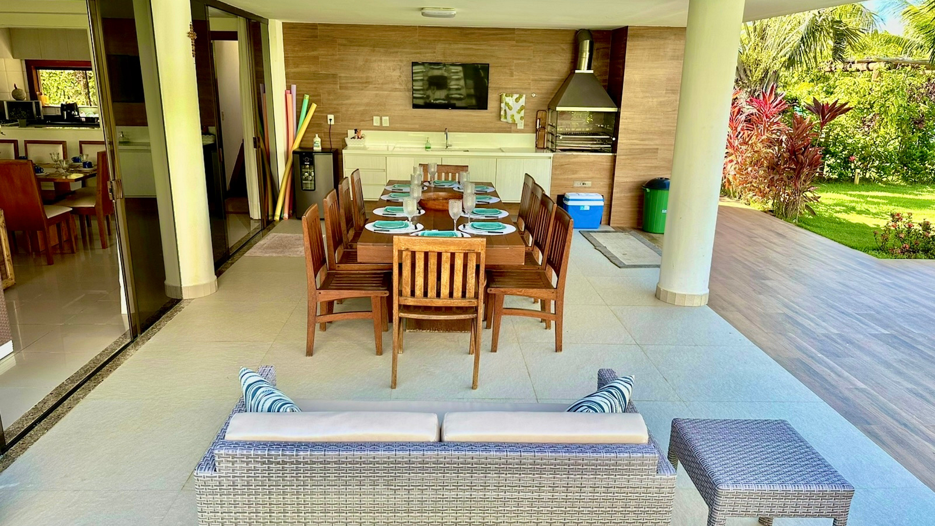 Hermosa casa en el mejor condominio de Guarajuba, a 230 METROS de la PLAYA, paradisíaca y semiprivada, con excelente espacio externo e interno, compuesta por cinco suites, decoradas y amuebladas, equipadas con ropa de cama, mesa y baño. Piscina con deck de madera con sombrillas y mesa redonda con 6 sillas y dos tumbonas.
