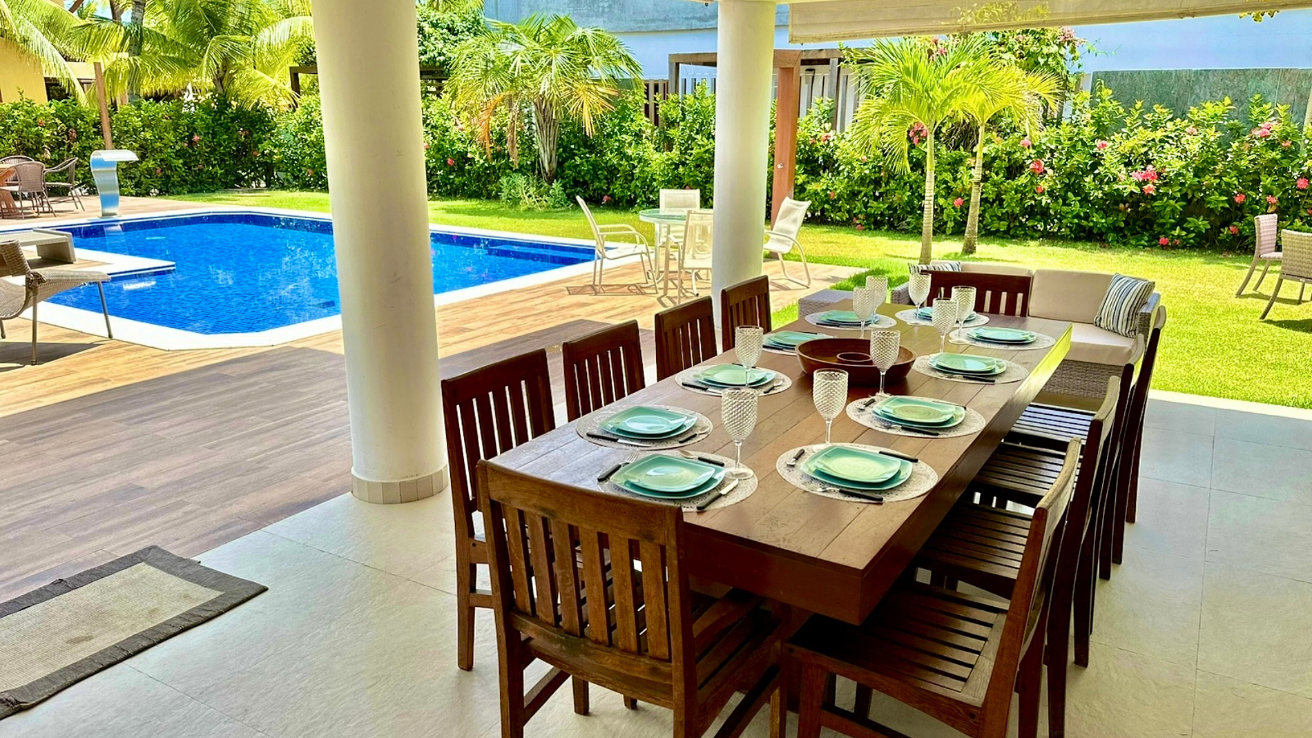 Hermosa casa en el mejor condominio de Guarajuba, a 50 METROS de la PLAYA, paradisíaca y semiprivada, con excelente espacio externo e interno, compuesta por cinco suites, decoradas y amuebladas, equipadas con ropa de cama, mesa y baño. Piscina con deck de madera con sombrillas y mesa redonda con 6 sillas y dos tumbonas.