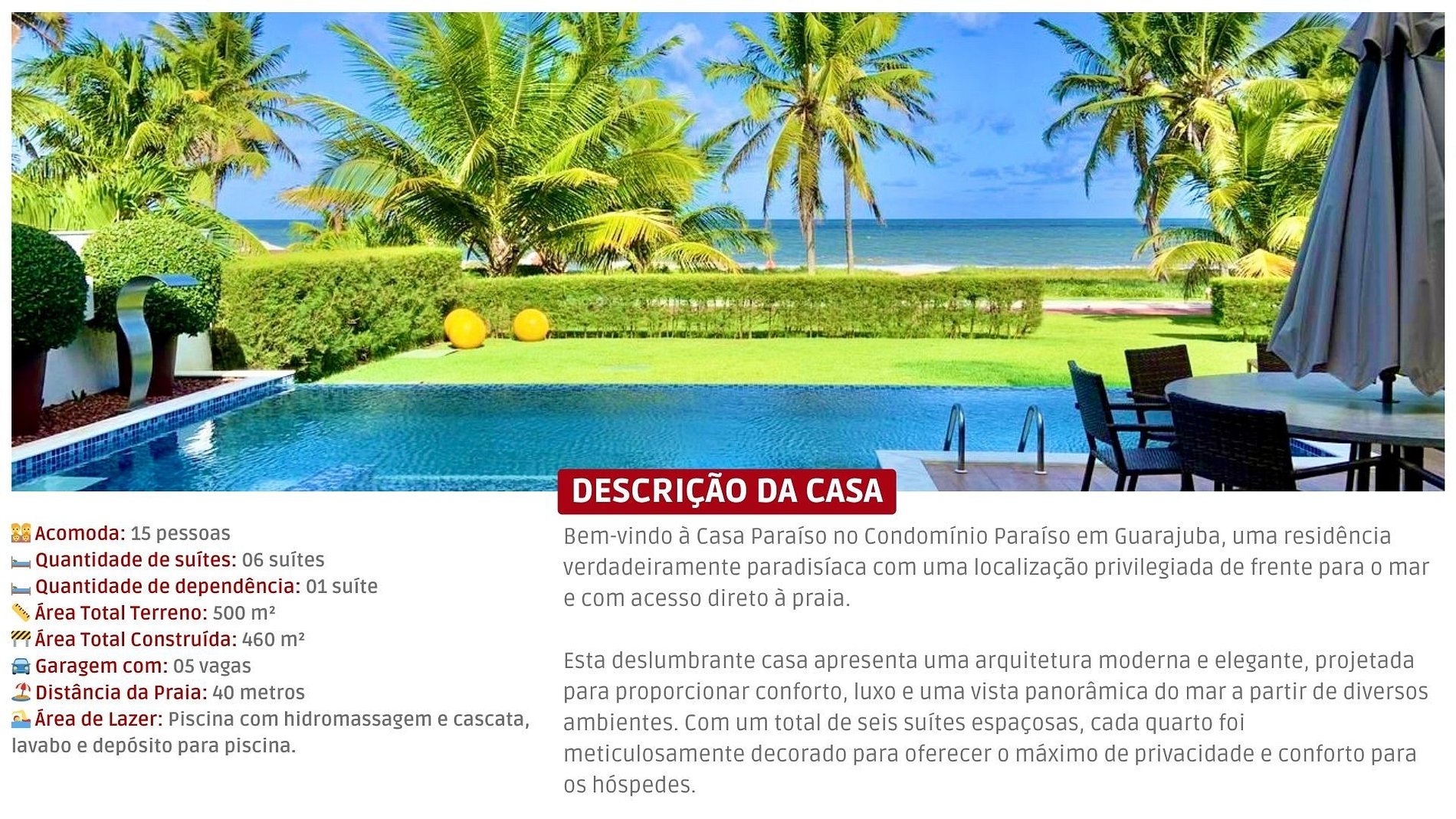 Bienvenido a Casa Paraíso en el Condominio Paraíso en Guarajuba, una residencia verdaderamente paradisíaca con una ubicación privilegiada frente al mar y acceso directo a la playa.