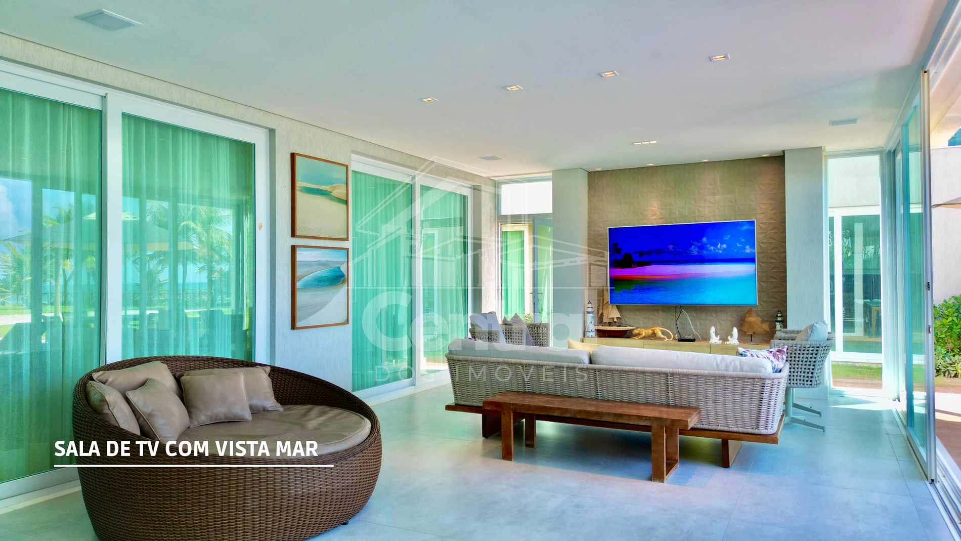 Térreo Uma suíte, sala com dois ambientes, sala de cinema climatizada com sofazao para cinco lugares, lavabo da sala, cozinha completa totalmente equipada, varandão frente mar com área de TV, lavabo da área gourmet, área gourmet com churrasqueira, cervejeira, bar, piscina com dois níveis de profundidade totalmente iluminada com hidromassagem, ampla área verde com quadra para FUT vôlei e Beach tênis, palco para shows, jacuzzi, sala de troféus, salão de jogos e muito mais