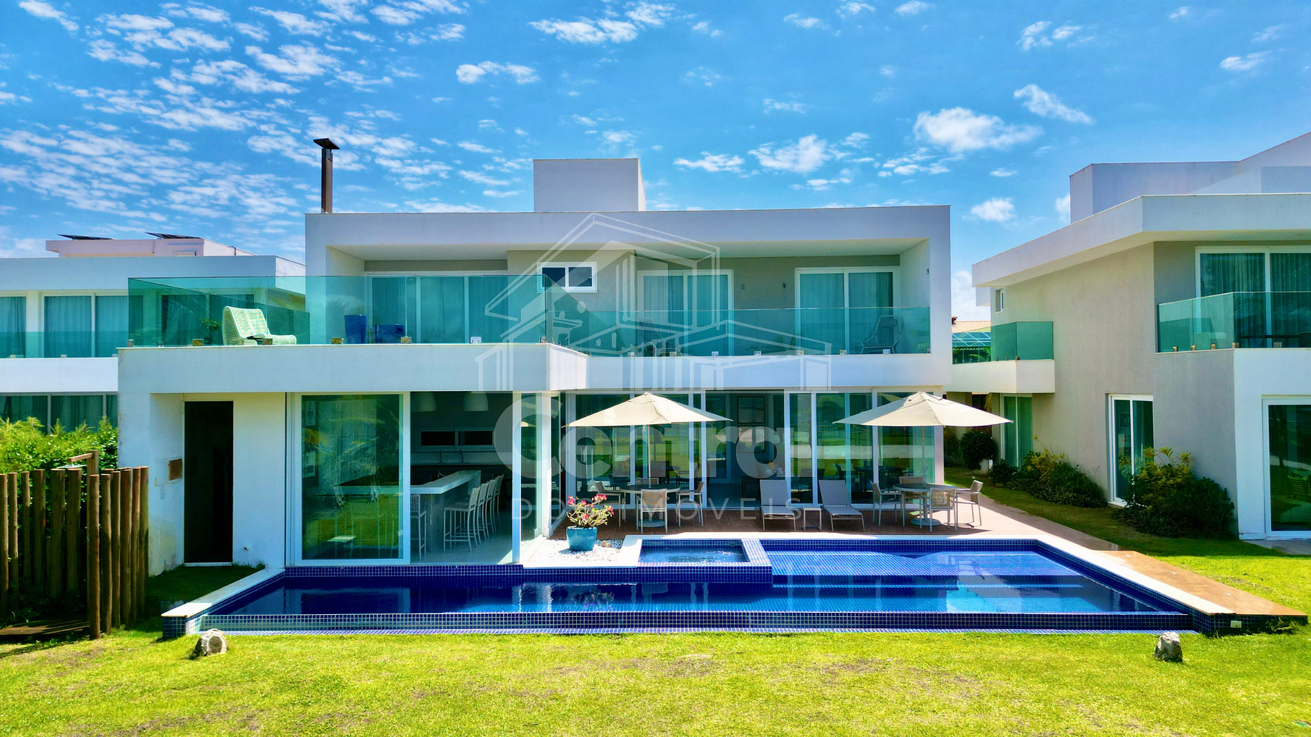 Térreo Uma suíte, sala com dois ambientes, sala de cinema climatizada com sofazao para cinco lugares, lavabo da sala, cozinha completa totalmente equipada, varandão frente mar com área de TV, lavabo da área gourmet, área gourmet com churrasqueira, cervejeira, bar, piscina com dois níveis de profundidade totalmente iluminada com hidromassagem, ampla área verde com quadra para FUT vôlei e Beach tênis, palco para shows, jacuzzi, sala de troféus, salão de jogos e muito mais