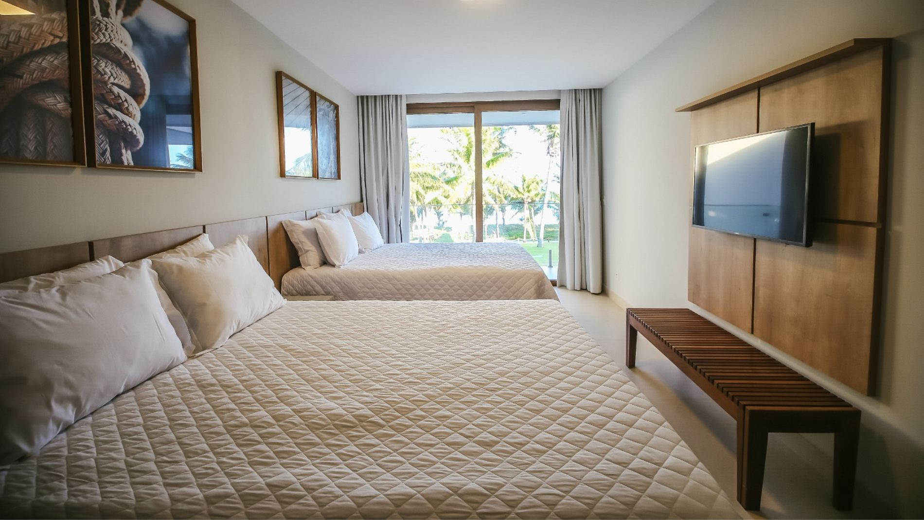 • Jardim tropical com coqueiros, criando um ambiente paradisíaco.